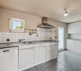 • modern kitchen with white cabinets, dark countertops, double oven, refrigerator, dishwasher, washing machine, natural light from windows, dining table and chairs