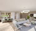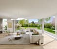 • Spacious open-plan living room and kitchen with large windows, hardwood floors, modern furniture, and a white globe pendant light. The room has access to a balcony or terrace with views of the surrounding nature.