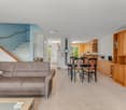 • Spacious living room with tile flooring, large windows, multiple plants, couch, dining table and chairs, coffee table, cat tree.