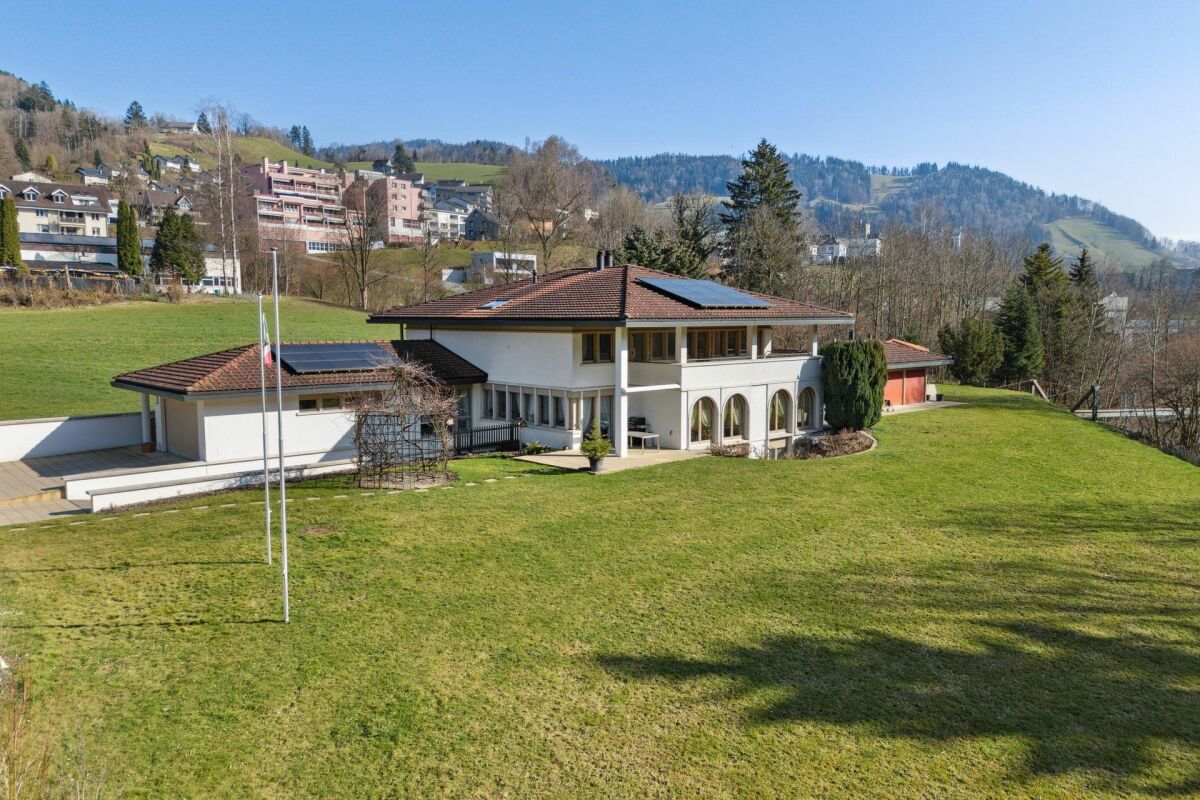 Für weitere Fragen oder eine Besichtigung stehe ich Ihnen gerne zur Verfügung. Ein persönlicher Eindruck vor Ort ersetzt viele Worte!Exklusive Rarität für Liebhaber: aussergewöhnlicher Landsitz auf grossem Grundstück in landschaftlich reizvoller Umgebung, mit Indoor-Pool und atemberaubendem Panoramablick. Die 1970 errichtete Liegenschaft ist in jeder Hinsicht aussergewöhnlich: von der individuellen Architektur über die enorm grosse Wohnfläche von ca. 300 m², den Indoor-Pool und der atemberaubenden - und praktisch ganzjährig nebelfreien - Weitsicht bis zu den schneebedeckten Alpen. Das Erdgeschoss besteht aus einem einzigen, rund 115 m² grossen Raum, der sich aus dem Entrée mit Windfang, dem Wohnbereich mit Cheminée, dem Essplatz und der Küche zusammensetzt. Dazu kommt der Wintergarten samt Terrasse, von dem man einen ungehinderten Blick bis zu den Bergen geniesst. Das Raumangebot umfasst einen grossen Vorplatz, fünf Zimmer, ein Badezimmer, eine Ankleide sowie einen Wirtschaftsraum. Ein grosszügiger Indoor-Pool mit Weitblick ist das Highlight im Untergeschoss. Die beiden Räume nebenan lassen sich für Fitness, Hobby oder andere Bedürfnisse nutzen. Einmalige, idyllische Lage: auf rund 900 Höhe kennt man eines nicht - Nebel. Dafür Sonne, Weitsicht und eine traumhafte Ruhe, die durch nichts gestört wird. Hier lebt man das Gefühl von Freiheit inmitten der Natur. Mit einer Sanierung der grosszügigen Wohnfläche ganz nach den eigenen Wünschen und Vorstellungen wird aus dieser Liegenschaft ein einmaliges Traumhaus an ebensolcher Lage.