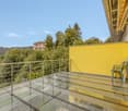 • Balcony with table and chairs, metal railing, potted plant, parasol, metal grill