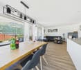 • open living room with a dining area, sliding glass doors leading to a terrace, large windows, wooden dining table, modern lamps, a carpet, and minimalist decor