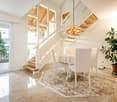 • tiled floor, stone wall, double staircase, white walls, skylight