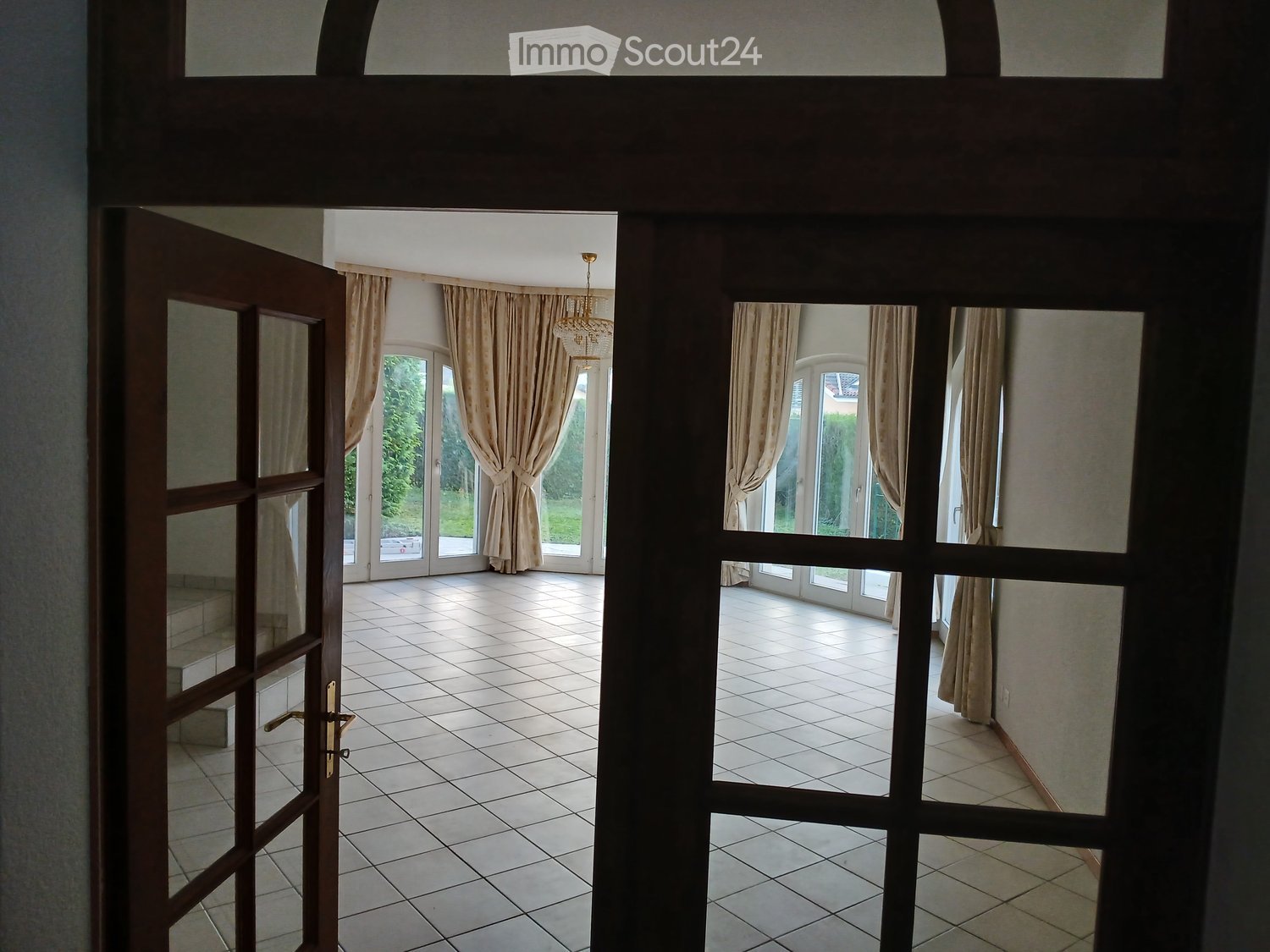 • Room with white walls, tiled floor, staircase, window with sliding doors, and a green garden view.