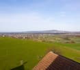 • large grassy area with small square cement pad, hedges, various trees, and views of mountain range