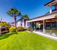 • Outdoor area with swimming pool, garden, white house, lawn, table and chairs