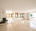 • White living room with sliding doors leading to the balcony. A rug is in the center, with a couch and a table. On the left is a shelf with glass cabinets, a table with frames and picture frames. In the distance, a garden with a swimming pool can be seen.