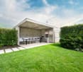 • Well maintained lawn with trimmed hedges and clear blue sky
