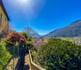 • Outdoor area with lawn, hedge, flowers, sun lounger, fenced entrance, mountainous background