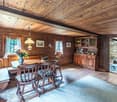 • room with wooden ceiling, stone walls, wooden floor, door, window, ceiling light