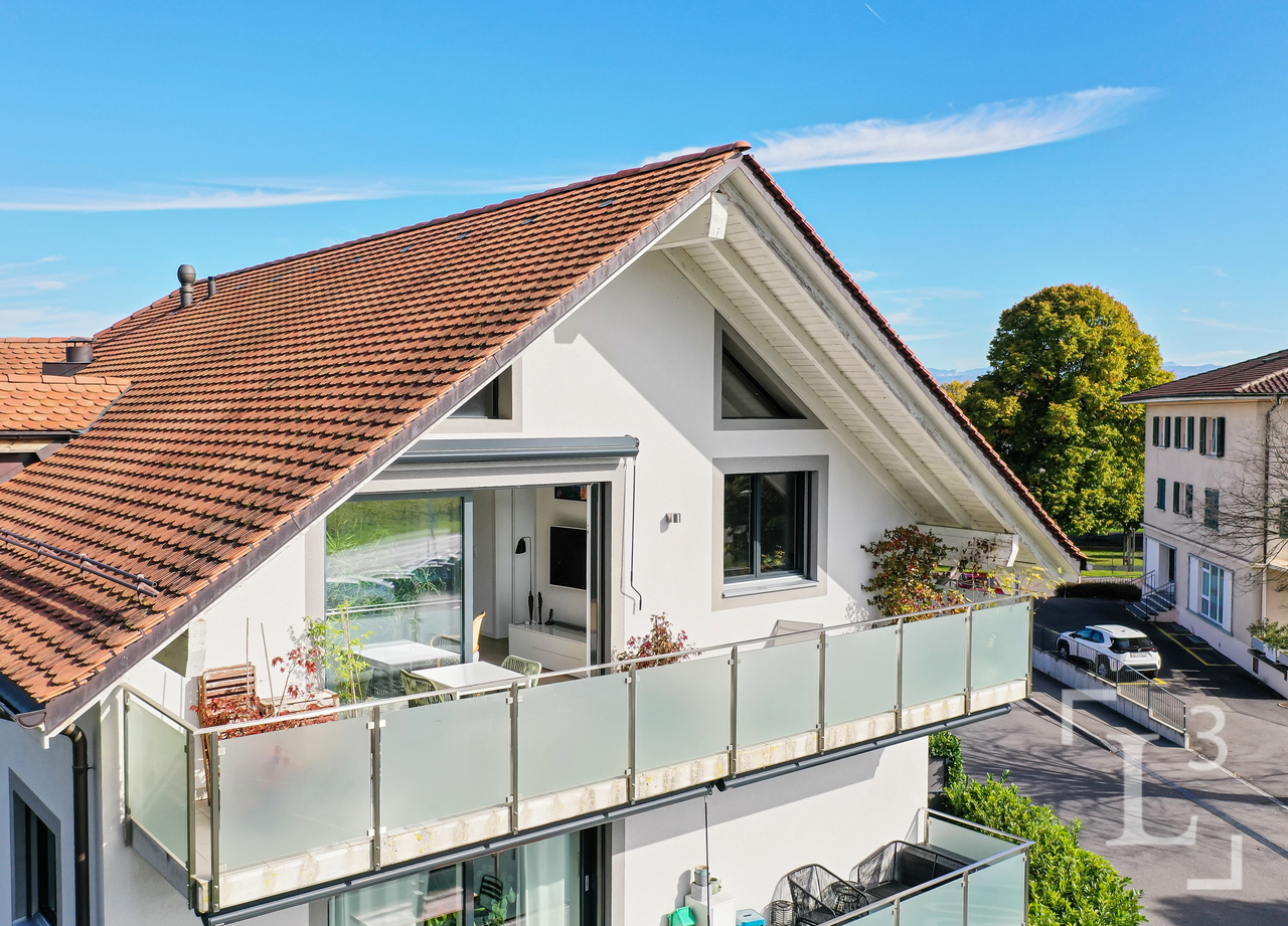 Découvrez ce splendide duplex, idéalement niché au sein d'un environnement paisible et prisé d'Eysins.Cette propriété conjugue avec brio de vastes intérieurs, une lumière naturelle abondante et un confort suprême, offrant ainsi une opportunité de style de vie agréablePoints Forts : • Dimensions Généreuses : Bénéficiant d'un impressionnant espace de combles de 114 m² avec des hauteurs sous plafond de plus 4 mètres, cette résidence offre une flexibilité remarquable pour un aménagement sur mesure et une adaptation à tous vos désirs. • Agencement Adaptable : Comprenant trois chambres bien proportionnées, ce foyer est parfaitement adapté à la vie de famille ou à l'établissement d'un bureau pour pratiquer le home-office. • Espace de Vie Ouvert et Lumineux : La zone de vie lumineuse intègre harmonieusement la cuisine, l'espace salle à manger et le salon, créant une atmosphère accueillante, parfaite pour recevoir et se détendre au quotidien. • Deux Salles de Bains : Deux salles de bains modernes assurent commodité et facilité pour tous les occupants. • Retraites Extérieures Privatives : Profitez de l'air frais sur deux balcons distincts, dont une vaste terrasse de 19,6 m² exposée plein sud, qui promet des vues dégagées et un ensoleillement optimal tout au long de la journée. • Stationnement Pratique : La propriété inclut deux places de parking dédiées : une place intérieure sécurisée et une place extérieure. • Rangement Supplémentaire : Une cave privée offre une capacité de rangement supplémentaire précieuse. Avantages de l'Emplacement Privilégié : • Connectivité Sans Effort : Bénéficiez d'un accès immédiat aux transports en commun et aux commodités essentielles du centre-ville animé d'Eysins. • Serein Mais Accessible : Savourez la tranquillité des environs tout en étant à quelques instants de Nyon et des principales connexions autoroutières. Cette propriété distinguée est prête à séduire les individus exigeants en quête d'une résidence qui allie harmonieusement espace de vie généreux, confort moderne et une belle qualité de vie.Entdecken Sie diese herrliche Maisonette-Wohnung, die ideal in einer friedlichen und beliebten Umgebung von Eysins eingebettet ist.Diese Immobilie verbindet auf brillante Weise großzügige Innenräume, reichlich natürliches Licht und höchsten Komfort und bietet somit eine Gelegenheit für einen angenehmen LebensstilHighlights: • Generöse Dimensionen: Mit einem beeindruckenden Dachgeschoss von 114 m² mit Deckenhöhen von über 4 Metern bietet diese Residenz eine bemerkenswerte Flexibilität für eine maßgeschneiderte Einrichtung und Anpassung an alle Ihre Wünsche. • Anpassungsfähige Einrichtung: Mit drei gut proportionierten Schlafzimmern ist dieses Heim perfekt für das Familienleben oder die Einrichtung eines Büros geeignet, um Home-Office zu praktizieren. • Offener, heller Wohnbereich: Der helle Wohnbereich integriert die Küche, den Essbereich und das Wohnzimmer harmonisch und schafft eine einladende Atmosphäre, die perfekt ist, um Gäste zu empfangen und sich im Alltag zu entspannen. • Zwei Badezimmer: Zwei moderne Bäder sorgen für Bequemlichkeit und Komfort für alle Bewohner. • Private Außenrückzugsbereiche: Genießen Sie die frische Luft auf zwei separaten Balkonen, darunter eine große, 19,6 m² große Südterrasse, die den ganzen Tag über einen freien Blick und optimale Sonneneinstrahlung verspricht. • Praktisches Parken: Das Anwesen umfasst zwei dedizierte Parkplätze: einen gesicherten...