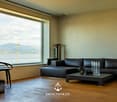 • Spacious open-plan living and dining area with large windows offering a scenic view. The living room features a comfortable sofa and armchair, while the dining area has a modern rectangular table with grey chairs. The room is decorated with abstract art p
