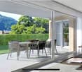 • Modern living room with a L-shaped couch, white carpet, round tables, a balcony, windows, and a painting
