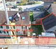 • Aerial view of a house under construction, new building, multiple houses in the background, green lawn