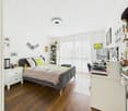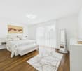 • Modern bedroom with a bed, lamps, nightstands, chair with blanket, shelf with decor, rug, pendant light, plant