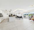 • Kitchen: Large open plan kitchen, modern cabinetry, large island with wine cooler, appliances including oven, dishwasher and washing machine, central lighting, wooden flooring