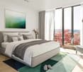 • Multi-story apartment building with balconies, surrounded by a grassy courtyard with walkways and benches. The building has a modern, minimalist design with large windows.