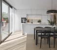• Open plan dining, living and kitchen area. Wooden floor. Large windows offering views of nature. Dining table with chairs, sofa, coffee table, modern kitchen with granite countertop, sink, faucet. Interior design with white walls, and elegant furniture.