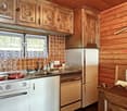 • The image shows a rustic kitchen and bathroom area. The kitchen features wooden cabinets, a marble countertop, and a hanging pot rack. The bathroom area has a vessel sink on a wooden vanity, with a decorative tile wall behind it. The overall style is a mi