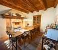 • Rustic dining room with wooden beamed ceiling, wooden dining table and chairs, fireplace, shelves with decorative items, and a cabinet with glassware.