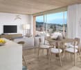 • White bathtub, twin sinks, modern decor, beige bedding, large bed, gray pillows, large bathroom mirror, multiple artwork, small rug.
