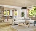 • Living room with white walls, white flooring, green couch, coffee table, dining room visible
