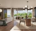 • Open-plan living and dining area with modern kitchen, hardwood flooring, black furniture, large windows overlooking the balcony, large grey couch