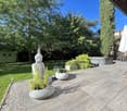 • Garden with well-maintained lawn, a large tree, plants, shrubs, a small flower bed, a paved path, and a white building in the background.