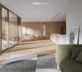 • Office: White walls, wooden flooring, glass doors leading to an outdoor terrace, desk with laptop, wooden cabinets, a vase with plants, and a lamp on the desk