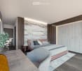 • Modern master bedroom with a large bed, desk, chair, built-in wardrobe, large windows