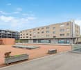 • multi-story building, cream-colored walls, many windows, balconies, paved walkway, parking area, small yard