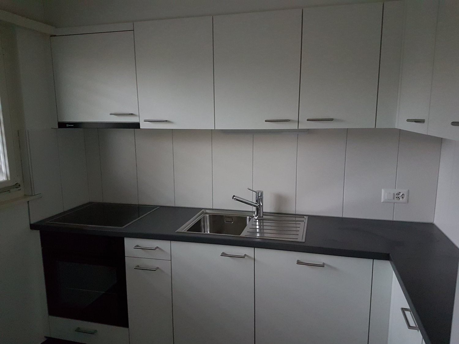 • Modern kitchen with white cabinets, black countertops, stainless steel sink, built-in oven, induction hob, and a window with a tree view outside.