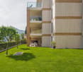 • 3-story building with arched windows, balconies, and a landscaped garden with grass and shrubs in the foreground