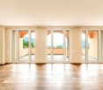 • empty room, wooden floors, white walls, large windows, kitchen island
