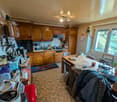 • Modern kitchen with tiled flooring, stainless steel sink, electric stove, cabinets, refrigerator, and storage unit.