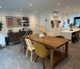 • large open space, large windows, dining table with chairs, sofa, decorative objects, colorful rug, indoor plants