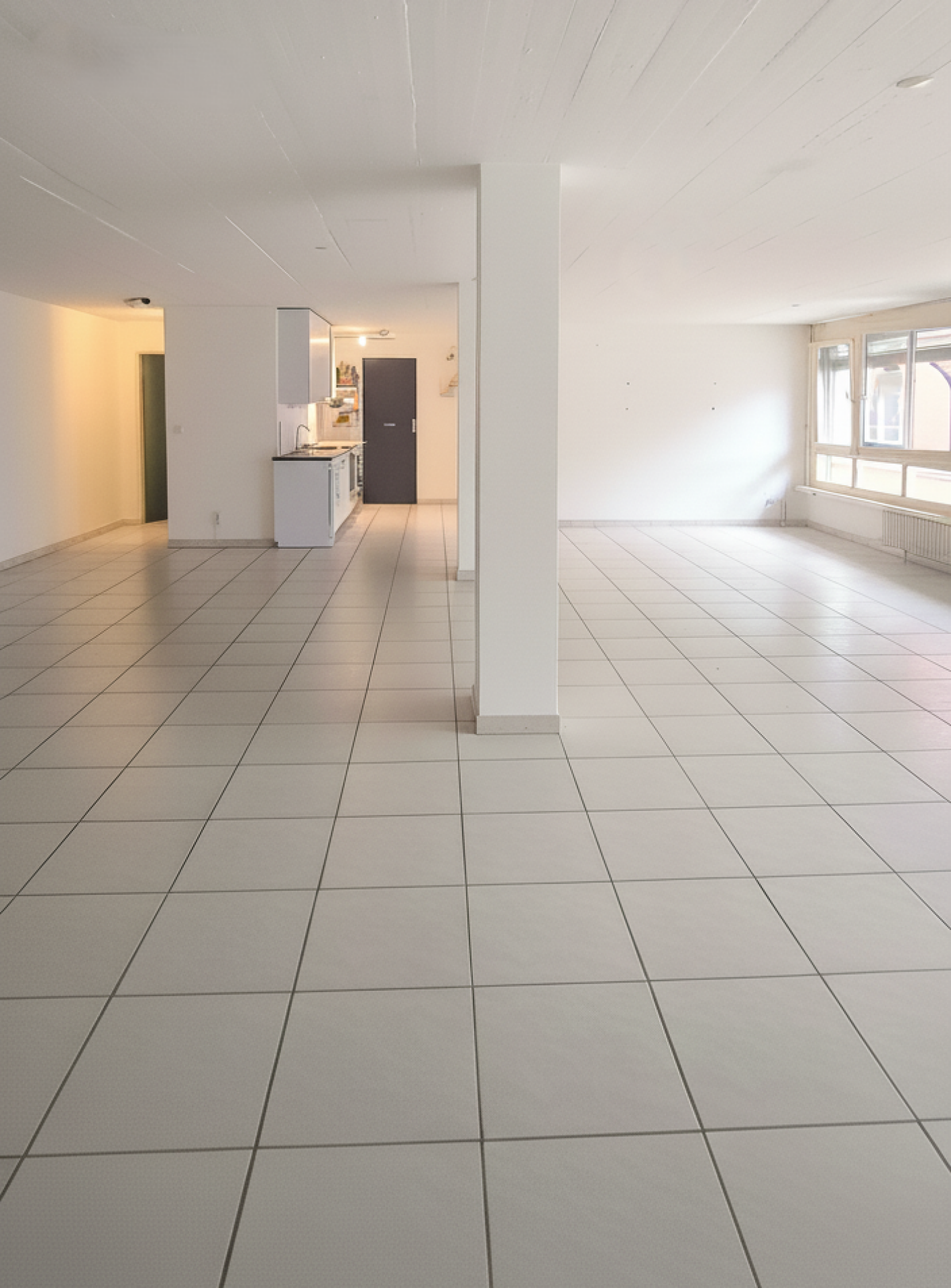 • Hardwood floors, White walls, Large windows, 2 doors.