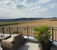 • Modern outdoor terrace with black table, metal chairs, glass railing, and potted plants. Beautiful views of surrounding countryside.