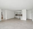 • living room and open kitchen, light colors, minimalist furniture, large windows