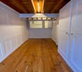 • wooden floor, tall wardrobes, small bench, window