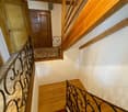 • wooden staircase, white ceiling, white walls, wall art