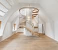 • Open plan kitchen, wooden flooring, white cabinets, integrated appliances, large spiral staircase leading to upper floor